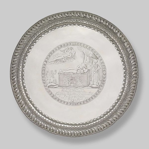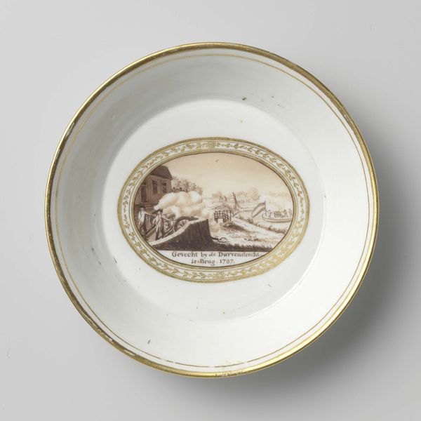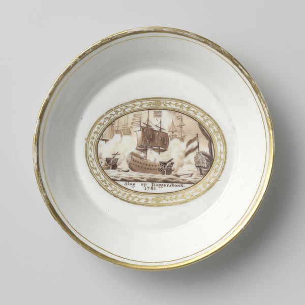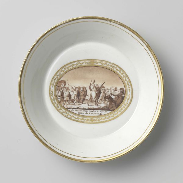This saucer, made by an anonymous artist, features an image of William the Silent crossing the Maas. The composition is structured around contrasting scales and shapes. Notice how the circular form of the saucer contrasts with the oval scene at its center, a vignette framed by a decorative border. Inside the oval, the sepia-toned figures are carefully arranged to draw the eye across the river, creating a sense of depth. The artist uses a limited palette, relying on tonal variations to define the forms and suggest the atmosphere of the scene. This reflects a broader artistic interest in the use of subdued colours to convey solemnity and historical significance. The very act of depicting a historical event on a functional object challenges the traditional hierarchy between high art and decorative arts. Such an object becomes a site where cultural memory is consumed and reinterpreted. It’s a reminder that art exists not in isolation, but as part of a larger cultural landscape.