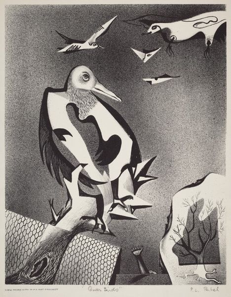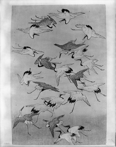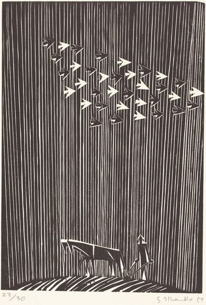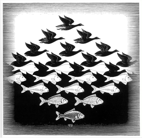 Editor: This is M.C. Escher's "Sky and Water II" from 1938. It's a woodcut print that immediately plays with your perception. The way the birds transform into fish is so seamless. How do you interpret this transformation through a formal lens? Curator: The genius of "Sky and Water II" lies in its formal articulation of tessellation. Observe how Escher manipulates positive and negative space. The white shapes of the fish become the black shapes of the birds, a perfect mirroring across the horizontal plane. Notice the precise repetition and interlocking of forms. Do you see how the compositional structure emphasizes this cyclical exchange? Editor: Yes, I see that now! The way each bird fits so snugly into the space defined by the fish. The stark contrast between black and white further accentuates the figures and creates dynamism. Curator: Precisely. The value contrast isn't merely decorative; it's structurally integral. Consider the implications of this visual equivalence. Escher seems to suggest that the essence of 'birdness' and 'fishness' is, at a structural level, interchangeable. Do you agree that this work invites a reconsideration of fixed categories? Editor: I think so! That's such an interesting way to think about it. Seeing how the shapes and contrasts define each other is enlightening. Thanks for explaining it so well! Curator: Indeed. Reflecting on the formal structure here opens exciting avenues for thought, wouldn’t you agree?