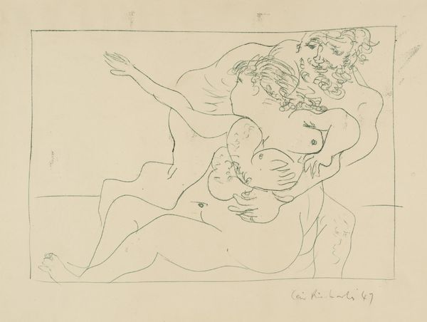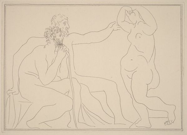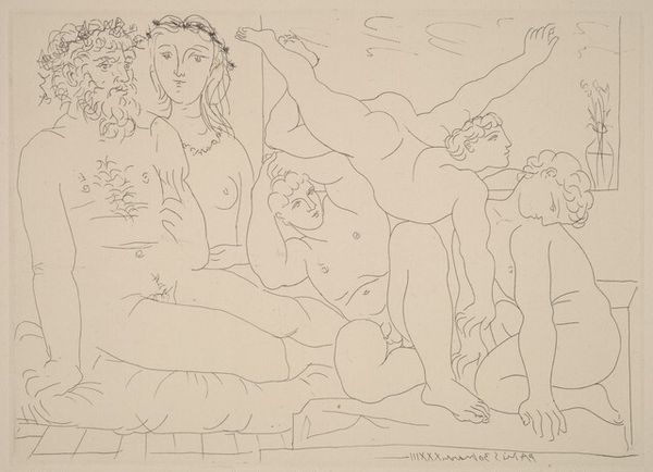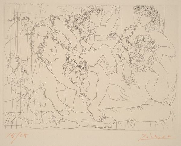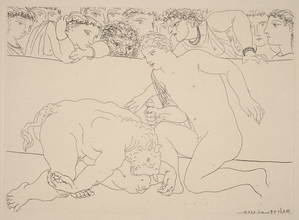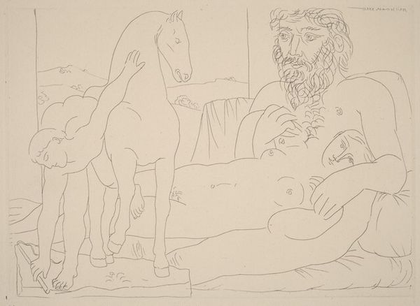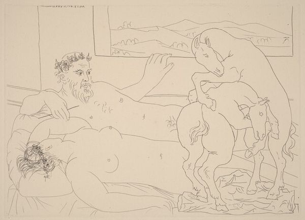 Curator: At first glance, this print from 1933 strikes me as an oddly playful scene rendered with stark, almost academic lines. It’s called "Sculptor and Model with a Sculpture Representing a Centaur Kissing a Woman" and Picasso made it during a period when he was deeply involved with classical themes. Editor: The term playful certainly springs to mind, but more than that I feel as if I am stumbling into a rather personal scene. It is voyeuristic. It has a light touch, a confident etching that belies a much darker undertone, a kind of silent observation. The sculptor lurking in the background... What does that say about the artist looking in? Curator: The artist figure is a critical detail here. This piece emerges from a time in Picasso’s career when his personal life and artistic interests intertwined significantly. The theme of the artist and model was, of course, well-worn, but he reinterprets it with his signature flair for distortion and, as you noted, underlying darkness. Editor: It really emphasizes the dynamic of artist and muse. But instead of traditional representation, it's a centaur and a woman caught in a perpetual, passionate kiss. Centaurs, creatures of both reason and beastly desire. This juxtaposition creates quite an emotional and intellectual tension, doesn't it? Curator: Precisely! The Centaur has, through the ages, served as an allegory to all the challenges posed by mankind. Is man capable of holding the basest, more visceral instincts at bay? We, as observers, are challenged to reconcile what civilization means in this case. The inclusion of the artist and the female model invites introspection on the very act of creation itself and its reflection back to us. The line becomes the thing which both delineates the subject matter and frames these debates for discussion. Editor: Looking at it through that lens, it’s about the creative process, the tension between Apollonian restraint and Dionysian freedom... Curator: A potent dialectic he would explore throughout his career. The print is a portal into the mind of the artist and also, his role within culture itself. It serves, in many ways, as a historical lens by which to view many challenges of our time still. Editor: The layers are remarkable, even within the stark simplicity of the lines themselves. I am left grappling with desire and control, with who is looking at whom, and how classical ideals continue to manifest in such an unconventional way.