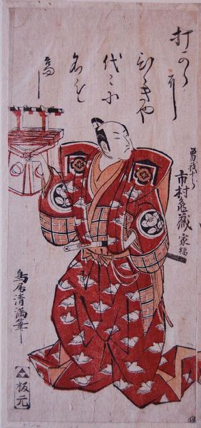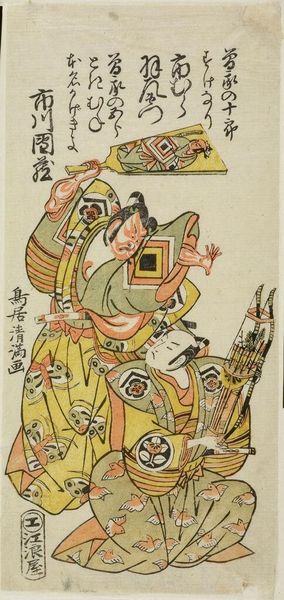 Editor: So, this striking print, “Actor BandÅ HikosaburÅ as Goro Tokimune” by Kitao Shigemasa… I’m fascinated by the patterned kimono and dramatic pose. What story do you think it’s trying to tell? Curator: Ah, yes, a Kabuki actor caught mid-scene! The dynamic tension—that gaze, the raised weapon—it's palpable. The butterflies might signify transformation, the fleeting nature of performance itself. Notice how the artist flattens the space, drawing us into this heightened moment of drama. What does that strike in you? Editor: It feels intimate, like we're sharing a secret with the character. Curator: Precisely! It transcends mere portraiture. It's about capturing the *essence* of a role, the fleeting magic of the stage, wouldn't you agree? Editor: Absolutely! I see it now, it's not just a picture; it's a portal! Curator: Exactly! And maybe that’s the real artistry, the invitation to step into another world.