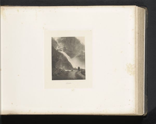 Editor: This photograph, "Gezicht op de Ringedalsfossen," was taken by Paul Lange before 1893. It's a gelatin-silver print of a powerful waterfall cascading through a rocky landscape. There's something deeply melancholic about it, a real sense of nature's grandeur but also its cold, unyielding force. What draws your eye, and how do you interpret this work? Curator: The waterfall itself functions as a powerful symbol. Water, of course, often represents cleansing and renewal, but here, given the image's date and context, it suggests something more complex. Think of the late 19th century, an era wrestling with industrialization. Does this image perhaps evoke a longing for the sublime power of untamed nature? The 'Gezicht', the view itself, implies something constructed; we are positioned *outside* nature, looking *at* it. How does that resonate? Editor: That’s fascinating! The sense of distance definitely contributes to that melancholic feel I noticed. So it's not just a pretty picture, but almost a commentary on our relationship with the natural world? Curator: Precisely! And the monochromatic palette enhances that sense of remove. Color can distract. The lack of it here focuses us on form and light, which serves the symbolic intent. Light, after all, is the primal symbol of knowledge and clarity. Editor: I see. So, the light playing on the water and rocks is not just aesthetic, it's loaded with meaning. I wouldn't have picked up on that on my own. Curator: It’s about recognizing the enduring symbolic language. Seeing how artists then, as now, speak through images to stir cultural memory and evoke deep feelings about nature's enduring presence in a rapidly changing world. Editor: Wow, that really opens up a whole new perspective on landscape photography for me! I'll never look at a waterfall the same way again. Curator: Excellent! Recognizing how imagery and visual cues transmit collective emotions is the key.