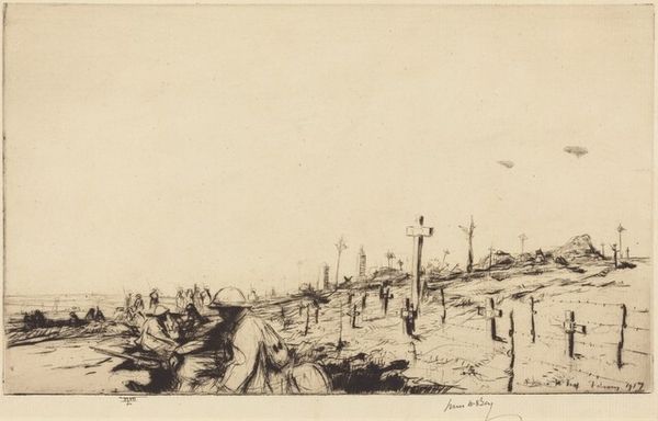 Editor: Here we have James McBey's 1917 etching, "The Somme Front." It's incredibly stark, the landscape barren and skeletal. What do you see in this piece? Curator: It's a powerful indictment of war. McBey’s “The Somme Front” isn’t just a landscape; it's a documentation of trauma inflicted upon both land and body, reflecting the collapse of civility. Note how the composition focuses on the devastation: the skeletal trees, the churned earth. Editor: There's a real sense of absence. Like a landscape without hope. Curator: Exactly. Consider too, when and by whom this was made. World War I fundamentally altered the sociopolitical landscape. Male identity was, in many cases, intrinsically linked to the call of duty, to the glory of combat. And we have artists grappling with a new understanding of bodily integrity and masculinity by the end of this catastrophic event. Who are these bodies obscured or missing? Whose story is elided in this 'realist' presentation? Editor: So the starkness is more than just visual, it's commenting on broader social ideas too. How can the visual, this devastated terrain, contribute to these questions? Curator: It critiques the narratives propagated by those in power during wartime. The idea of duty, of bravery. There's very little glory apparent here, is there? Just raw desolation, and a critical deconstruction of established social tenets, especially ideas about war and gender. Consider it a conscious disruption. Do you agree? Editor: I think it disrupts that old guard entirely; it demands a reimagining of what "heroism" means, and what price is too high. The landscape is literally screaming that there is an exorbitant price, and we continue to perpetuate the myth. Thank you - a landscape is never *just* a landscape, I suppose. Curator: Precisely. And by examining art like McBey's through an intersectional lens, we gain access to some very complex and significant societal critiques.