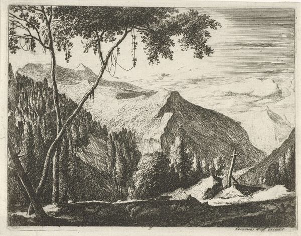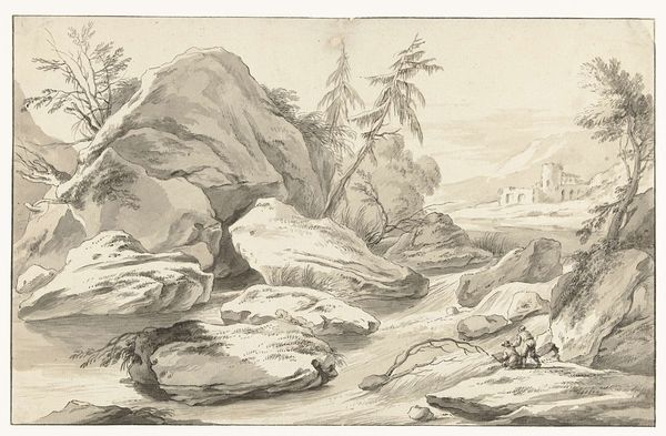 Curator: This is Boëtius Adamsz. Bolswert’s "Landschap met rotsen aan kust," created in 1614. It's an engraving, part of the Dutch Golden Age and currently held in the Rijksmuseum. Editor: My goodness, talk about a dramatic first impression. That jagged rock face practically leaps off the page! There’s such a raw, untamed energy despite the fine lines. Makes you want to feel the spray of the sea, doesn't it? Curator: Precisely! Note the masterful use of line to create texture. The engraver varies line weight and density to distinguish between rock, water, and sky, offering an immersive depth that surpasses the print's flatness. See, how the sharp realism captures that distinctive dynamism? Editor: I do. Though, personally, I find that the inclusion of the two tiny human figures emphasizes nature’s overpowering force. They’re practically swallowed up by the scale of those rocks. What are they doing, do you think? Plotting an escape or simply lost in wonder? Curator: The figures indeed serve as an important element. I wouldn’t call them overpowered as much as situated within an imbalanced spatial and thematic binary between man and the landscape; The narrative could signify pilgrimage. It reflects Baroque sensibility—man versus nature, spiritual contemplation through engagement with dramatic, overwhelming forms, even… a hint of mortality, dare I suggest! Editor: A pilgrimage... perhaps they’re lost in thought about the inevitability of their own demise, yes, in the grand scheme. This makes the work poignant; I mean, to consider those small humans wrestling with that colossal landscape, grappling with questions of their fleeting existence... heavy stuff, beautifully captured in stark lines and tonal complexity! It brings us, ourselves, closer to feeling. Curator: A rather evocative conclusion, wouldn't you say? It presents an aesthetic paradox - intricate, minute strokes render powerful magnitude, philosophical meditation... truly a sublime study in binary opposition! Editor: Indeed! Art serving both as mirror and a lens through which to both feel the weight and levity of one’s journey through our chaotic and transient, earthly plane, eh? A divine irony!