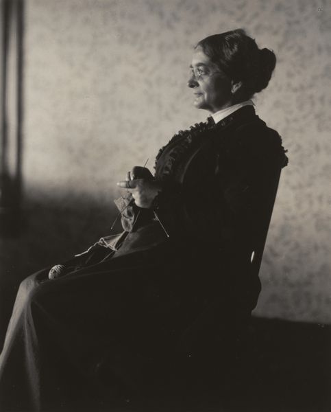 Curator: What strikes you first about this photograph, "Abigail Kyzer", attributed to Prentice H. Polk, likely taken between 1933 and 1981? Editor: It's undeniably elegant. The contrast between the glossy fabric of her dress and the soft, almost cloud-like background is quite striking. The limited tonal range certainly accentuates the textural differences. Curator: Indeed. Polk, known for his portraits documenting the African American community, captures a sense of poise here, but also something deeper. Look at the gaze she directs back at us—there's a challenge, almost a knowing. How does that interplay with the conventions of portraiture? Editor: Precisely! It subverts them. She's turned away, offering us a three-quarter view, a break from direct confrontation. But then that direct, unflinching stare…it suggests agency, a refusal to be entirely objectified. That, combined with the near-symmetry of her shawl, clasped neatly at the waist, adds an intriguing tension to the formal composition. Curator: The monochrome amplifies this, doesn't it? Think of black-and-white photography's associations with memory, with historical documentation. This image transcends simple portraiture. The silver gelatin print serves not just as representation but as a vessel for her identity and strength through her gaze. Editor: Yes, it transcends its technical aspects. The surface sheen plays with the ambient light, but in rendering all those soft gray transitions, we are faced with a powerful presence. It speaks to how materiality shapes and contains not just our images of things but also our ideas about history. Curator: Considering this through the lens of African American art, there's also the added weight of representation, breaking away from racist caricature. How might her subtle defiance play into this context? Editor: Absolutely. There's a reclamation happening. Her gaze suggests intelligence, self-awareness. Polk masterfully plays on the historical denial of Black subjectivity to showcase a profound awareness. Curator: A potent image. Thanks for teasing out the nuanced details. Editor: My pleasure. It's truly fascinating to decode how so much character emerges from so few constructed and controlled details.