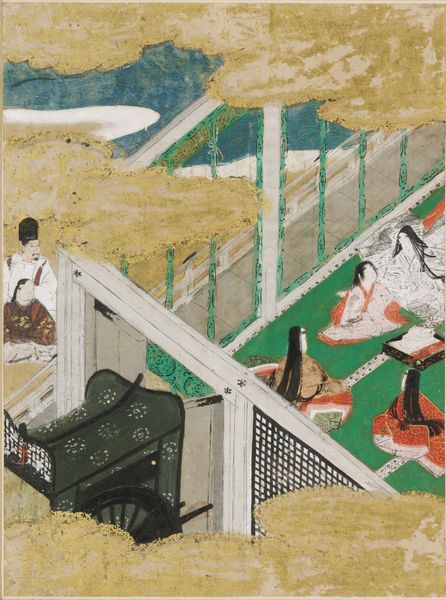 Editor: This is "Beneath the Oak," an illustration to Chapter 46 of the Tale of Genji by Tosa Mitsunobu. I find the gold leaf overlaying the wintery scene to be quite striking. What symbols or motifs resonate with you most deeply here? Curator: The oak, or "Shiigamoto," is itself a powerful symbol. In Japanese literature and art, trees often represent longevity and steadfastness, but also shelter and refuge. How does the snow change the perception of this sheltered space? Editor: It feels isolating, almost like the figure is trapped in beauty. Curator: Precisely. The falling snow, rendered in such delicate detail, is both beautiful and suggestive of isolation. It visually separates the figures, even as the architecture seems to connect them. It is a fascinating interplay. Editor: So, the beauty and the isolation are intertwined? Curator: Yes, and that tension speaks volumes about the complexities of human relationships, doesn't it? Editor: Absolutely. It makes me see the piece in a completely new light.