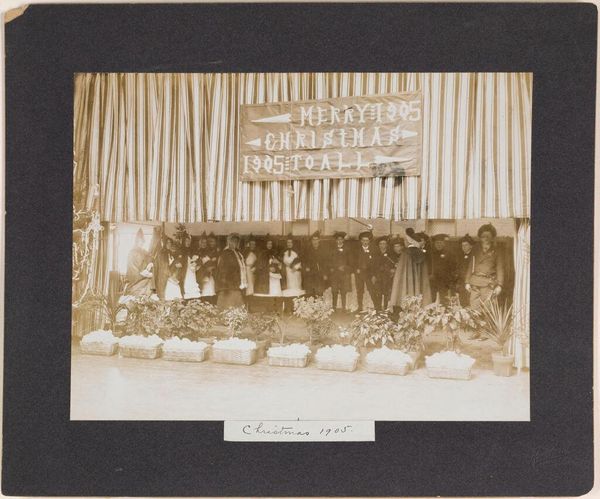 Curator: This photograph, taken by Woodhead Studio, is titled "Defectives, Epileptics: United States. Massachusetts. Palmer. State Hospital for Epileptics: Christmas 1905." The sepia tones immediately establish a somber mood despite the festive subject. Editor: The composition is stark, isn't it? The symmetry of the Christmas trees flanking the subjects, the high ceiling, and the banner create a somewhat unsettling environment, a space both celebratory and institutional. Curator: The photographer meticulously arranged the patients and staff. Notice how the light reflects off the white dresses, creating a focal point. It subtly directs the viewer's eye through the varied textures. Editor: But that's precisely my discomfort. The term "Defectives, Epileptics" as a label is jarring. It is a stark reminder of the dehumanizing language used historically to marginalize these individuals. Are we truly seeing individuals, or are they being presented as a collective, defined by their medical conditions? Curator: I concede that the title presents ethical concerns. But when viewing the image, I perceive a record of a social event, a formal grouping, carefully arranged. Its composition offers insight into the aesthetic preferences of the time. Editor: I see a complex image, one that reflects both the potential for human connection and the persistent shadow of social injustice and marginalization. Curator: I can appreciate your perspective now.