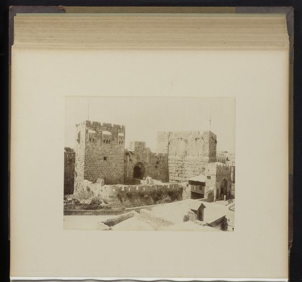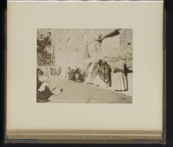 Curator: Looking at this gelatin-silver print from between 1867 and 1885, taken by Félix Bonfils, we see a scene titled "Straat in Jeruzalem naar de toren Phasaël," which translates to "Street in Jerusalem towards the tower Phasaël." Editor: It feels frozen, doesn’t it? A tableau vivant almost, everyone suspended mid-action on this ancient street. I'm struck by the contrast—the monumental architecture and the very human bustle of the marketplace. Curator: Bonfils was part of a wave of photographers documenting the Middle East for Western audiences. Consider the role of the Orientalist lens here. How might this photograph have shaped perceptions of Jerusalem and its inhabitants? Editor: Absolutely. There's an undeniable power dynamic at play. This image, while ostensibly capturing a 'slice of life', inevitably reflects the photographer's own biases and the expectations of his European audience. How might the realities of trade and daily life be obscured or romanticized? Who benefits from this form of representation? Curator: Precisely. Bonfils' work contributed to a visual archive that often exoticized the East, fitting it into pre-conceived notions. Yet, it's also important to see how photographs like these offer some insight into trade routes. Editor: Yes, it’s complex. We can simultaneously appreciate the technical skill, note its artistic intention and acknowledge the problematic historical context. The figures become signifiers as they perform for the photographer in that time and space. Who are they outside of this frame? What can we extract from the narrative through these people frozen in place? Curator: Indeed. Understanding the nuances and layered meanings present in this photograph encourages us to ask critical questions about representation, power, and cultural exchange in the 19th century. Editor: Agreed. It is so important to not assume this photo provides us an accurate, unfiltered perspective of Jerusalem at that time. To see it as an interpretation, is vital.