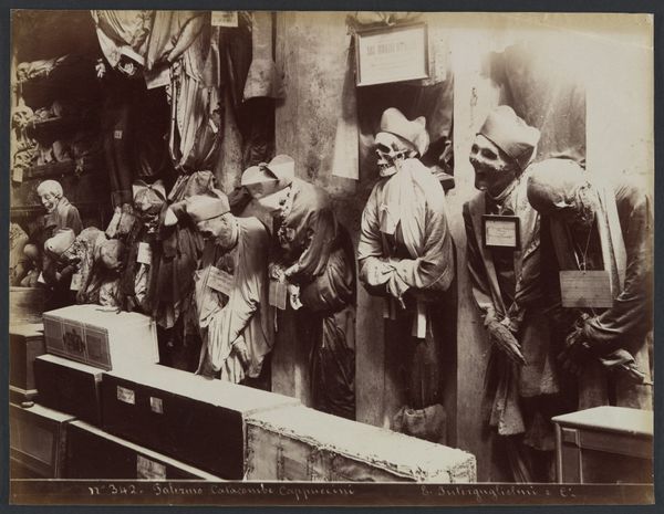 Editor: This haunting image, “N 154 Palermo, Catacomben del cappuccini, preti,” captured by Giuseppe Incorpora between 1893 and 1903, presents a stark tableau. The mummified priests, still adorned in their vestments, create a strangely compelling and macabre scene. What strikes you most about its historical and cultural context? Curator: What I see is a potent meditation on mortality and the enduring power of symbols. The catacombs themselves represent a liminal space between life and death, and the priests, even in death, are arranged to suggest a continuation of their earthly roles. It invites us to contemplate the psychological impact of facing our inevitable end. How does this visual representation speak to cultural anxieties and beliefs around death? Editor: That's fascinating. It makes me wonder about the rituals surrounding death in that time. Were the catacombs a way of preserving memory, defying death, or something else entirely? Curator: Precisely! Consider the clothing. The garments denote status and roles, suggesting the persistence of social structures beyond the grave. What emotions does their preservation in these garments evoke? Is it reverence, fear, or perhaps even a sense of cultural pride? Editor: I think it is a mix. I initially felt shock, but then curiosity. I do wonder what it says about their culture to preserve these bodies, as though suspended in time. Curator: It speaks volumes about cultural memory and continuity. The image itself becomes a powerful symbol, encoding complex emotions and beliefs for future generations to decode. Perhaps what is really striking is how these relics, displayed, transform our notions of art, preservation, and ultimately, remembrance. Editor: This conversation has changed how I see the photograph. It’s more than just a creepy image; it is a preserved record of both a culture and its fears.