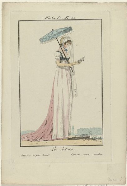 Editor: This is "The Masculine Gender," an engraving made in 1787. The artist is Henry Kingsbury. It looks like a satire. There's a figure dressed in very elaborate, perhaps over-the-top women’s clothing... all poofy skirt and enormous hat and umbrella... but something feels “off”. What catches your eye in this image? Curator: What catches *my* eye, you ask? Hmm… beyond the immediately obvious, almost cartoonish exaggeration, there's a palpable tension. The title hints at it, of course, that delicious irony. This isn’t just about appearances. It feels like Kingsbury is poking fun at societal expectations of gender, but also the very real constraints and absurdities of fashion at the time. Tell me, what makes you say something feels "off?" Editor: Well, the stance is kind of rigid. And the legs…they seem more muscular than I would expect from someone in such elaborate, almost frivolous, clothing. Curator: Precisely! It’s that discordant note, that visual clash that elevates it beyond mere caricature. We're meant to feel that discomfort, that questioning. Is Kingsbury criticizing dandyism? Mocking the performance of femininity? Is it social commentary, gender exploration, or is it just a laugh? Maybe all of the above! And don't you find that tension exciting? Editor: Definitely exciting! I never thought a simple line engraving could be so… loaded. Thanks for making me look beyond the surface. Curator: The pleasure's all mine! It's often in those subtle "off" moments that the true magic, and meaning, of art resides. Never be afraid to question, to look deeper, and trust your own intuitive response!