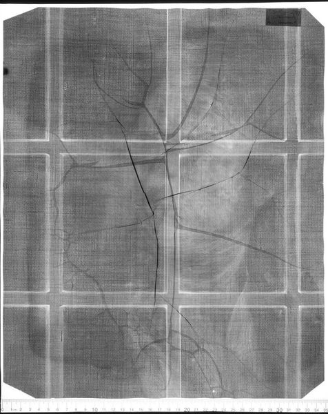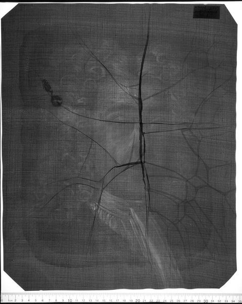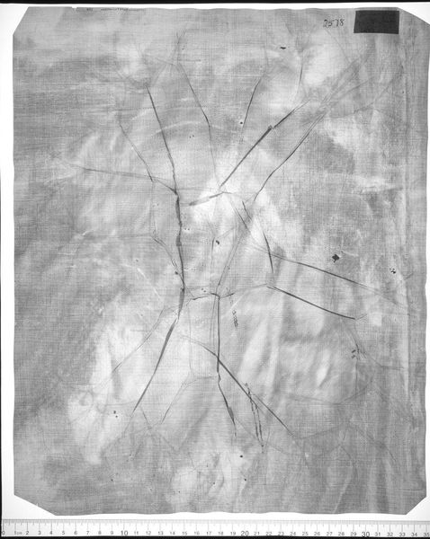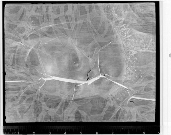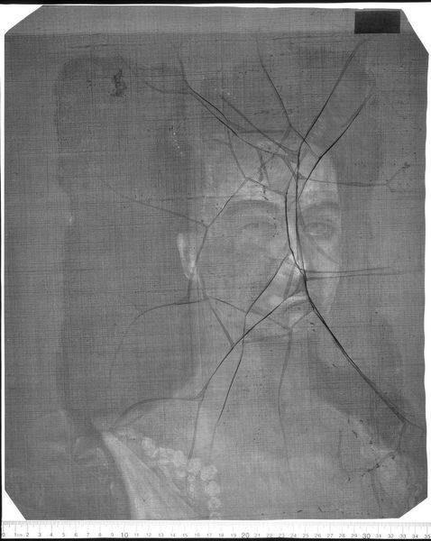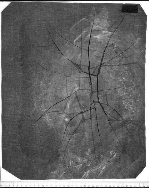 Curator: This is an X-radiograph of "Portrait of G. Flagg IV," originally by Robert Feke, now residing in the Harvard Art Museums. Editor: It's eerie, like looking at a ghost. The stark black lines fragment the image, yet the portrait's structure still persists. Curator: Indeed, the X-ray reveals the artist’s process, the underpainting, the materials used, and even damage accumulated over time. The cracks tell a story of material decay. Editor: The composition is disrupted, yet the formal elements remain. Note how the subject's gaze is still direct, holding your attention despite the damage and the diagnostic nature of the image. Curator: It speaks to the labor involved, not just Feke's original work, but also the scientific processes used for preservation and study of the art object. Editor: I see a haunting beauty, a semiotic disruption that paradoxically reinforces the power of the portrait. Curator: It’s a fascinating intersection of art history and material science, really. Editor: A powerful reminder that even hidden layers contribute to an artwork's meaning.