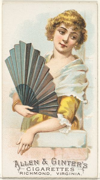 This lithograph was created by Allen & Ginter for their Cigarettes Brands, and features a woman seated on a chair, holding a pink fan, adorned with a golden crescent moon on her head. The crescent, since antiquity, has been associated with the feminine, particularly with lunar goddesses such as Artemis. The fan, an object of social etiquette, allowed women to signal interest, flirt or even reject an admirer. Notice how this woman shields part of her face with it, adding an aura of mystery. The fan reappears throughout history, from ancient Egypt, where they were used in religious ceremonies, to medieval Europe, where they were associated with nobility. Even today, we can see traces of it, perhaps less overtly, but its allure as an object of secrecy and concealed emotions persists, engaging us on a subconscious level. Like a recurring dream, this image has an emotional power to transcend time.