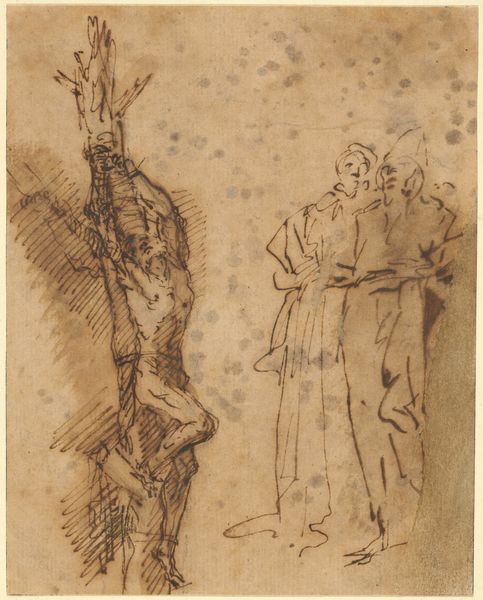 Ignaz Günther made this pen and brown ink drawing, “Maria, Johannes und Maria Magdalena unter dem Kreuz,” in eighteenth-century Germany. As a visual representation of the Bible, this drawing and others like it helped reinforce the religious teachings of the Catholic Church, which was a powerful social institution in that time. Günther was a sculptor whose works adorned churches across southern Germany, helping to spread the messages of the Bible to a largely illiterate population. The way the figures are drawn, with their exaggerated expressions of grief, could be seen as a reflection of the emotional intensity of the Baroque artistic style that was popular during that time. It is worth asking whether the artist sought to reinforce the social status quo or whether the emotive style of the work and the graphic rendering of suffering challenges the religious institutions of the day. To understand this drawing better, we can explore its historical context by looking at church records, religious texts, and other artwork from the same time period.