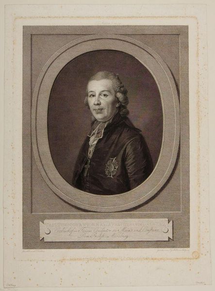 Curator: Robert Le Lorrain, engraved by Jacques Nicolas Tardieu, presents a formal portrait, but what draws your eye? Editor: The tools at the base of the image really stand out. What can you tell me about their significance? Curator: Note how the printmaking process elevates the sculptor by showcasing his tools alongside his portrait. Tardieu is not just depicting Lorrain, he's carefully crafting an image of labor and artistic identity for consumption. Editor: That’s interesting, so it’s about the means of production being made visible? Curator: Precisely. The print itself becomes a commodity, showcasing the sculptor's status and skill within a specific social context. I never considered the printmaking as a form of labor before. Editor: Me neither. Thanks for shedding light on it.