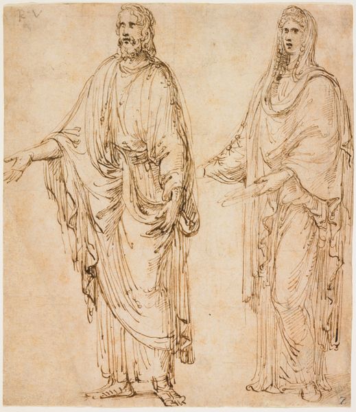 Editor: Here we have a drawing entitled "Saint Lucy and a Saint (recto); Alexander the Great in Profile (verso)" created by Agnolo del Mazziere sometime between 1500 and 1512. It looks like the artist used pen, ink, graphite, and charcoal on paper. I'm immediately struck by the delicate linework, but also how unfinished it feels. What elements stand out to you? Curator: The use of line is indeed the primary vehicle for conveying form and texture here. Notice how the varying densities of the cross-hatching create areas of shadow and volume, giving a sculptural quality to the figures despite the overall flatness of the picture plane. What does the structure of these lines suggest to you? Editor: Well, the repeated strokes seem to emphasize the drapery and create a sense of movement, though the faces are much less detailed and feel almost ghostly. Curator: Precisely. The artist's choices concerning line weight and density create a hierarchy of importance. The robust strokes used for the garments create a tangible sense of weight, anchoring the figures. Consider how this contrasts with the almost ethereal treatment of the faces. The lines define edges but leave the features understated, prompting the viewer to contemplate the subjects’ inner lives through pose and gesture rather than precise likeness. How does this compare to other Renaissance drawings you have studied? Editor: Most of the finished Renaissance drawings I've seen focus on detailed rendering. This feels much more like a preliminary sketch exploring form. Curator: Exactly! We might think of this drawing as a moment of becoming, the nascent form of something yet to be fully realized. Editor: It's amazing how much you can interpret simply by focusing on the formal elements. Curator: Indeed, by carefully considering the artist’s structural and material choices, we can unearth considerable meaning.