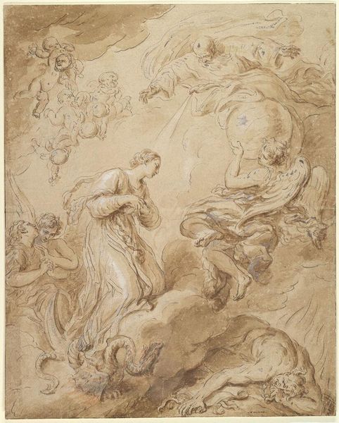 Jacques Bellange's "Mythological Subject," now at the Art Institute of Chicago, is a drawing rendered with sanguine, red chalk, which lends the figures a warm, almost palpable vitality. The composition unfolds as a complex layering of forms, with a muscular figure reclining at the forefront, surrounded by a cluster of ethereal beings. Bellange's use of line is particularly striking. He employs delicate, wispy strokes to define the contours of the bodies, creating a sense of movement and dynamism. The figures seem to emerge from and recede into the ground, emphasizing the fluidity of the medium itself. We can see Bellange subtly questioning the illusionistic traditions of Renaissance art. The drawing engages with the idea of transformation, a common theme in mythology. It challenges fixed meanings and embraces ambiguity, a key element in the artist's broader exploration of human experience. The artwork invites us to ponder the interplay between form and content, and to consider how the artist destabilizes established meanings.