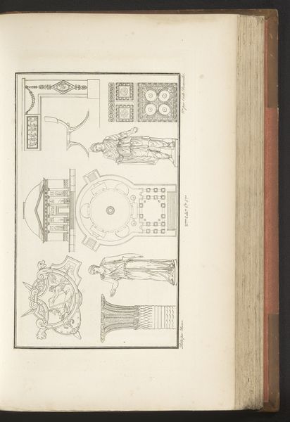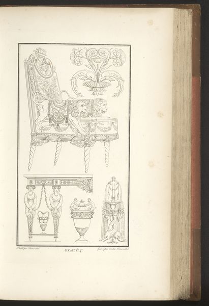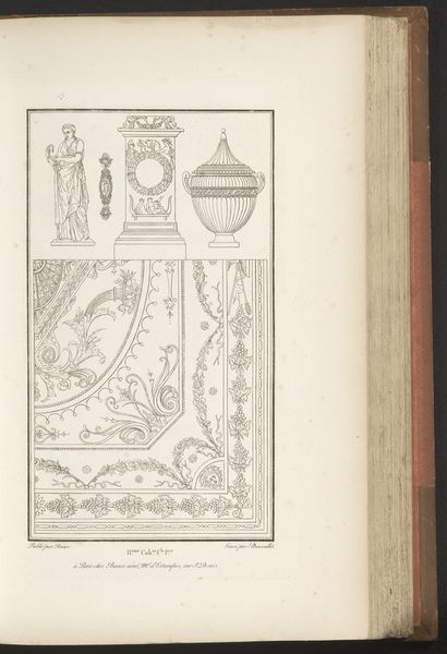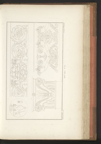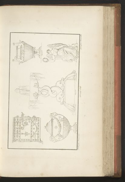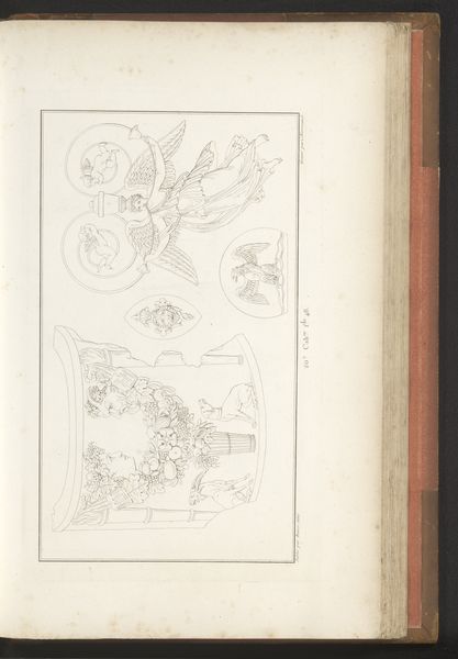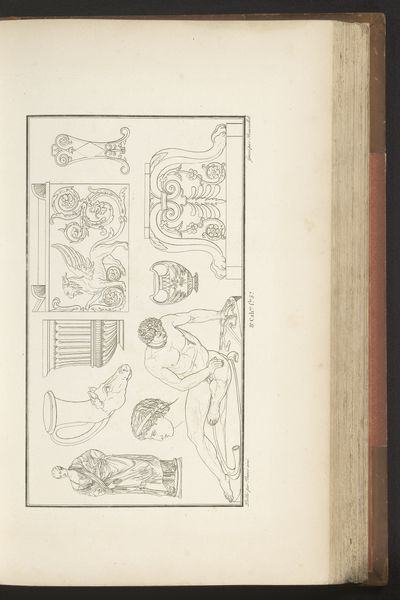 This is 'Olifantenschaal' by Pierre-Nicolas Beauvallet. Made with delicate lines, the drawing presents a series of classical motifs, seemingly extracted from different objects or sculptural works, arranged in a scattered composition. The eye is immediately drawn to the titular 'Olifantenschaal' or Elephant Scale, which dominates the composition and exhibits the opulence of its classical inspiration. The lines delineating the piece suggest a commitment to structure and symmetry. The careful arrangement of the scattered elements across the page is not without intent, and the drawing invites the viewer to consider how these disparate forms might be related. By juxtaposing these forms, Beauvallet destabilizes established meanings. We are left not with fixed interpretations but with an invitation to engage with art as an ongoing process of inquiry.