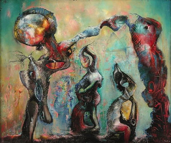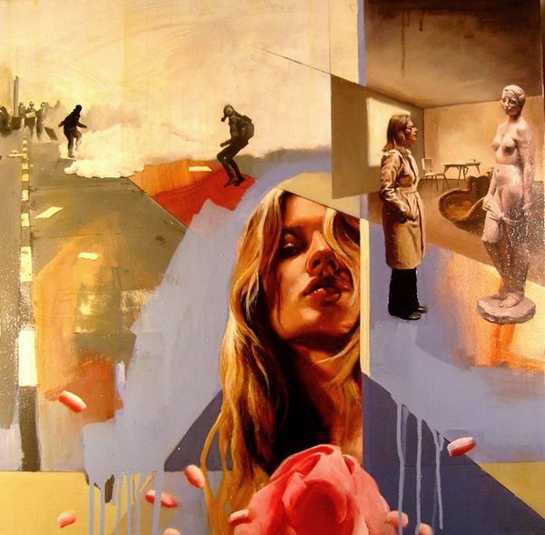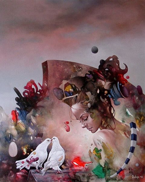 Dragan Ilić Di Vogo, who was born in 1962, painted "Waiting for Boris" with what looks like oils, layering and glazing to create a surreal and kinda haunting image. The surface texture varies from smooth, almost porcelain skin, to these gloopy, dreamlike forms swirling around the central figure. There's a real push-pull between representation and abstraction. Look at the way the artist renders the woman's face with such detail, and then contrast that with the ghostly figures behind her. There's a dark, almost gothic sensibility to the work. The little swirl of green and yellow above her right ear is particularly intriguing. It seems to anchor the composition, balancing the weight of the woman's gaze with the fantastical elements of the painting. It reminds me a bit of some of the weirder stuff in Odilon Redon’s paintings, where you can see the artist playing with color and form in an almost hallucinatory way. It’s a reminder that art can embrace mystery and ambiguity.