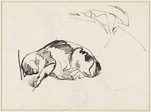 Curator: Here we have Nicolai Abildgaard's "En liggende bjørn," or "A Reclining Bear," rendered sometime between 1743 and 1809. Abildgaard worked primarily with ink in this drawing, a medium that lends itself so well to the depiction of textures. Editor: Well, my first impression is of profound weariness. The bear looks absolutely exhausted, doesn't it? All that fur just seems to weigh him down. And that somber, almost brooding, brown wash in the background—it’s like he's carrying the weight of the world on his furry shoulders. Curator: It’s a potent image of animal nature. Abildgaard was deeply influenced by the Neoclassical emphasis on form and line, yet also gravitated towards Romanticism’s fascination with the sublime and the raw power of nature. The bear, often a symbol of strength, is here shown in a state of repose, perhaps even vulnerability. The tight curls that express the bear's fur and form almost gives the effect of him reclining upon a chaise lounge. Editor: I think you've hit the nail on the head with that "vulnerability" reading. We expect a bear to be fearsome, and here he is, curled up, almost foetal, paws tucked near his face. It's strangely endearing, this deconstruction of a symbol. Also, this piece reminds me a bit of something I may have seen from Goya - his mastery over ink and wash. Curator: Interesting point. Bears in art often serve as symbols of either brute force or untamed wilderness, or even figures in allegorical tales. In contrast, this work presents an intriguing juxtaposition, an intimacy. Consider how he rendered each contour of the fur and muscle...the weight is practically palpable. Perhaps Abildgaard sought to humanize this creature. Editor: Maybe so. Or maybe, to bear-ize humans? If that makes any sense. Either way, this sleepy bear makes me want to curl up and nap for about a hundred years myself. Curator: A powerful resonance between viewer and subject, wouldn't you say? I find that compelling. It prompts us to see ourselves mirrored in this magnificent beast, revealing shared vulnerabilities and inherent gentleness beneath even the most formidable exterior. Editor: A moment of quiet empathy across species. I appreciate how Abildgaard captures that so economically.