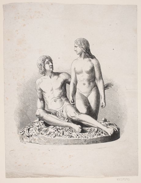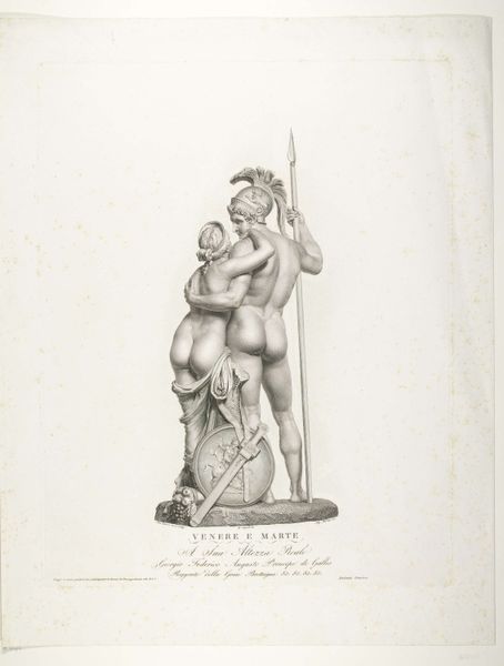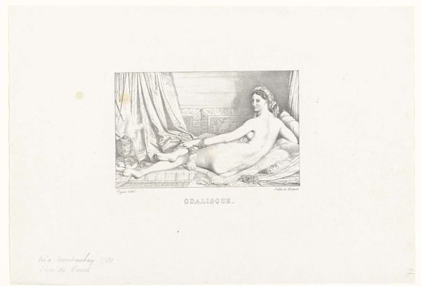 Editor: This is Angelo Bertini’s engraving "Naiade," created between 1793 and 1838. It has a very classical feel, and I’m struck by the contrast between the smooth, flowing lines of the figure and the almost harsh, geometric lines of the base she's resting on. What visual elements stand out to you most? Curator: The piece's formal qualities are deeply rooted in Neoclassical ideals, emphasizing clarity of line and form. Notice how the artist uses engraving to achieve a tonal range that mimics the texture and smoothness of sculpture, specifically emulating the style of Antonio Canova. Are you seeing any semiotic relation with its period style? Editor: Yes, the Neoclassical style evokes ideas of order and reason, almost a revival of Greco-Roman ideals... But how does the figure itself play into this? Curator: Consider the reclining pose, the idealized anatomy. This is less about portraying a specific individual and more about embodying an allegorical figure, a naiad—a water nymph. Bertini uses line and form to evoke a sense of timeless beauty. Can you spot the symbolism within the figures to convey the broader idea of the "Naiade?" Editor: There’s a child playing a harp. I can infer how this scene alludes to harmony. Are there some more allegorical elements? Curator: Reflect on how the solid geometric structure represents firmness in shape as its basic structure is more apparent that its delicate composition. Bertini also guides your sight towards an ideal setting that gives significance to that classical sculpture’s visual. Editor: This conversation has refined my comprehension about lines and the figure compositions with visual order through careful assessment of the elements. Thank you for making clear about symbolism, references, and styles in Bertini’s art piece. Curator: A fascinating engagement, bringing new ideas and perspectives about historical content and the use of classical lines for structure!
