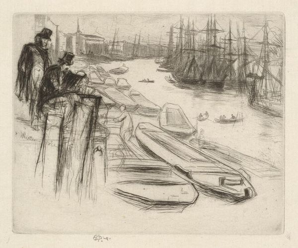 Editor: Here we have "The Little Pool," an etching and drypoint print by James Abbott McNeill Whistler from 1861. I'm struck by its delicate lines and how it captures a sense of quiet activity along the waterfront. How do you interpret this work through a formal lens? Curator: Focusing solely on its formal properties, one immediately notes the intricate network of lines that define the composition. Whistler masterfully employs etching to create varying degrees of depth and texture. Observe how the density of lines in the foreground contrasts with the more sparsely rendered background, effectively creating a sense of spatial recession. How does this play with realism? Editor: I see what you mean. The realism is implied through perspective but not literally transcribed. It feels more like a fleeting impression of a place. But aren't there aesthetic elements drawn from elsewhere? Curator: Precisely. Consider the influence of Japonisme, which significantly impacted Whistler’s aesthetic. The asymmetrical arrangement of the boats and figures, combined with the emphasis on line over form, subtly evokes the compositional principles of Japanese prints. Could the apparent flatness of the picture plane relate to that as well? Editor: Yes, it minimizes traditional western perspectival depth, which lends to a flattening effect and draws the eye towards the intricate details rather than illusionistic space. Thank you, seeing it this way highlights its complexity! Curator: And it also highlights the piece’s engagement with contemporary aesthetic concerns, showcasing a dialogue between realism, Japonisme, and an emerging modernist sensibility. It's all in the line work!