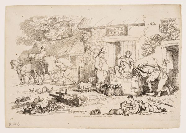 Claes Jansz. Visscher created this etching, *Washery and Bleaching Fields*, around 1600. The composition is divided into two distinct halves. The left side portrays an open, rural landscape, while the right features an enclosed urban scene, creating a visual contrast between nature and industry. The landscape uses linear perspective, drawing the eye into the background, whilst the building is depicted with sharp, precise lines, emphasizing its architectural form. The foreground is crowded with barrels, tools, and workers. This arrangement suggests a hierarchy where manual labor supports the structured environment. The materiality of the etching is crucial as the lines create texture and depth. The trees framing the scene add a sense of enclosure, focusing attention on the activities within. The print invites us to consider how labor and landscape were being organized and represented during this period of increasing urbanization.
