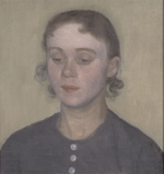 Editor: This is "Portrait of a Young Girl with Flower," an oil painting by Sarah Purser. It gives off this quietly melancholic vibe, doesn’t it? Like she's caught in a thoughtful moment. What strikes you when you look at it? Curator: Well, firstly, I get this profound sense of intimacy, a quiet sharing of space. Purser’s impasto brushstrokes almost feel like she's sculpting light and shadow onto the canvas, capturing a fleeting moment of girlhood with its inherent vulnerability and grace. But there's also something a little… ambiguous in her expression, wouldn't you say? Editor: Ambiguous how? Curator: In her gaze, the slightest downturn of the lips, a hint of knowing that exceeds her apparent youth. Does that make you wonder what she might be contemplating? Perhaps some unspoken story? Editor: Absolutely! It’s like she's holding onto a secret. And the flower, a little touch of colour, almost feels symbolic. Curator: It does. That small purple bloom hints at hope, renewal, or even a lost love. It acts as an emotional counterpoint, preventing the piece from succumbing completely to melancholy. Perhaps it mirrors the blossoming potential within the young girl herself? It begs a reflection: aren’t we all just portraits of moments, suspended in paint? Editor: I love that. Seeing the painting as a frozen moment, pregnant with untold stories. That really shifted my perspective! Curator: It’s funny, isn’t it? Art often holds up a mirror, not just to the subject, but to ourselves as viewers.