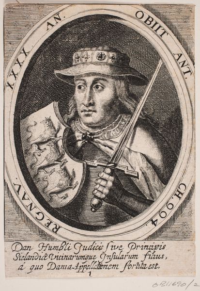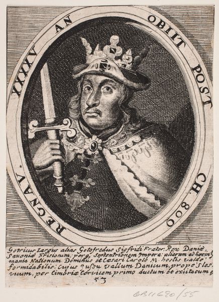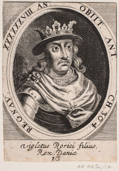 Editor: We're looking at "Kong Niels," a 1646 engraving. It's a portrait, quite detailed given the medium, depicting a king. It strikes me as very formal and official, befitting a royal portrait, but there is a vulnerability that gives it depth. What do you see in this piece, from a broader historical viewpoint? Curator: This image encapsulates the Renaissance’s engagement with power, identity, and the politics of representation. While appearing as a simple portrait, it’s actually participating in a longer discourse about the legitimacy and visibility of rulers and how this played out in 17th-century Europe. The use of print, an accessible medium, hints at a desire to disseminate this image of power. How do you think it challenges or reinforces ideas about the role of the monarchy at that time? Editor: That's interesting, because I mainly saw it as an individual likeness, but you're right, prints allowed wider circulation. Maybe the artist was trying to solidify his position and broadcast this to a wide audience. And I wonder, how much agency did the King have in his portrayal, in constructing and shaping that public image? Curator: Precisely! Understanding agency within these portrayals opens a critical conversation. Were there strategic aesthetic choices made to convey specific messages of authority, lineage, or divine right? This can be inferred by studying how elements like his crown, clothing, and scepter are highlighted. In a world undergoing rapid political change, art became a battleground for defining and defending ideologies, and these images played a pivotal role. Considering these points, has your perception of the piece changed? Editor: Absolutely! I now see it not just as a picture of a king, but as an artifact deeply embedded in the power struggles and communication strategies of its time. Curator: Exactly, a vital clue to unlocking a broader cultural and historical narrative.