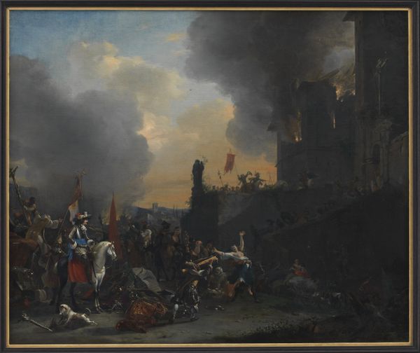 Editor: So here we have Johannes Lingelbach's "Italian Marketplace with a Quack Dentist," painted in 1651, rendered with oil paints and currently housed in the Rijksmuseum. The marketplace teems with activity, yet the muted color palette gives it a somewhat somber feel. What stands out to you in this genre painting? Curator: The chaos, actually, speaks to me. Lingelbach wasn’t just painting a pretty picture, was he? He's capturing the whole *vibe* of a bustling marketplace. The light and shadow play feels deliberate. See how it emphasizes the “quack dentist”? Almost like a little theatre stage. What do you make of his unusual profession featured here? Editor: Right! I mean, a dentist in the middle of a marketplace feels... unusual, to say the least! Maybe it's a commentary on accessible healthcare, or a jab at medical charlatans? The crumbling Roman architecture in the background – it creates this sense of past glory juxtaposed with everyday life, doesn’t it? Curator: Absolutely. It's Rome, after all! Ruins are just part of the scenery. Lingelbach cleverly places this fleeting moment, tooth-pulling and all, against a backdrop of enduring history. He is making us wonder, “Will the dentist be remembered or will it be the Roman ruins?”. He nudges us toward that perspective, you know? How does that sit with you? Editor: It’s a clever visual trick! So, the painting isn't *just* about the scene in the market. The backdrop frames this sense of transient human activity set against timeless history. Very cool, it gives a new meaning to urban art. Curator: Precisely. These little everyday stories playing out against a backdrop of ancient grandeur. I find the idea so darn romantic, in an oddball way! I can picture Lingelbach enjoying this market every day! Editor: Thanks for shining a light on Lingelbach's vision! It is not a flat view of a marketplace; I'm leaving with an understanding of Rome's relationship between its fleeting everyday and its constant history. Curator: My pleasure, art is always offering more if we just meet it halfway!