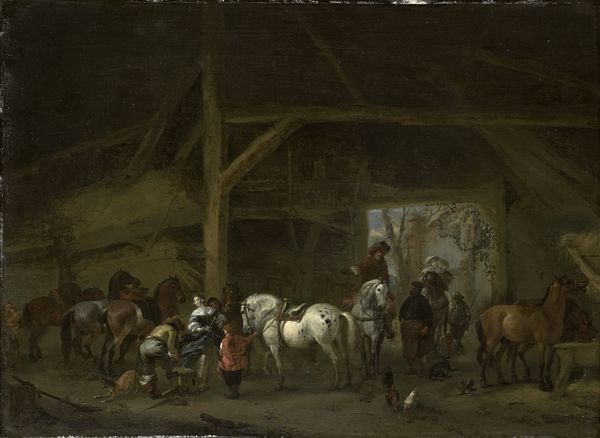 Pieter Bout rendered this oil-on-panel scene, "Horsemen Halted on a Mountain Pass," with an eye for the details of daily life. Note how the artist depicts a small cluster of figures pausing by a rocky outcrop, a moment of respite on their journey. Dominating the foreground are the horses, their weary postures emphasized by the sag of their bodies and drooping heads. Horses have been potent symbols across cultures, representing vitality, power, and freedom, yet here, their weariness speaks of the toils of travel and labor. Observe the figure pointing into the distance, perhaps indicating the route ahead. This gesture echoes through art history, seen in classical depictions of guides and explorers, and even in religious scenes where a prophet points towards a divine path. Consider how the cave mouth in the background offers both shelter and mystery. Caves often symbolize the subconscious, a place of hidden knowledge and potential danger. It's fascinating how Bout uses these age-old symbols to create a scene that feels both familiar and deeply evocative, tapping into our collective memory of journeys, rest, and the unknown.