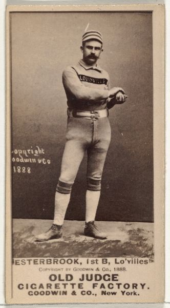 Editor: This is a photographic print from 1889, a baseball card really, featuring Frank J. "The Texas Wonder" Hoffman, a pitcher for Denver. The card was part of the "Old Judge" series made to promote Old Judge Cigarettes. I find the sepia tone very evocative, like looking into a distant past. How do you interpret this work as a symbolic representation of its time? Curator: Consider how this seemingly simple image taps into deeper currents of American cultural identity. Baseball itself was becoming a powerful symbol of national unity, wasn't it? But think about how Hoffman is posed, clutching the ball. It's almost totemic, like an oracle holding a sacred object. What emotional power do you think the baseball, in that specific pose, might hold for viewers of the time? Editor: I guess the ball could symbolize the promise of victory, the embodiment of skill and strategy, even destiny perhaps? Is that a stretch? Curator: Not at all! And think about the "Old Judge" cigarette connection. Cigarettes, also a rising cultural symbol of modernity and perhaps, a certain rugged individualism, linked here with athletic prowess. The card becomes a miniature tableau encapsulating ideas of health, leisure, and national pride. In a way, these cards are like modern-day icons of their time. Editor: That’s fascinating! So, it’s not just a baseball card, but a carefully constructed piece of visual rhetoric? Curator: Precisely! Every detail contributes to a carefully cultivated image, playing upon potent cultural symbols of the era, leaving us with something resonant even today. The "Texas Wonder," a symbol imbued with the values of that specific era. Editor: I never thought of it that way before. Thanks, I learned a lot about looking past face value and seeing the symbols embedded within a seemingly simple image! Curator: My pleasure! Remembering that art and advertising can reveal so much about ourselves and our shared pasts makes looking at it more interesting.