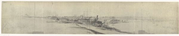 Editor: So, this is Whistler's "The Thames," an etching from 1896. It feels...quiet, almost melancholy, with this vast expanse of water and hazy skyline. What do you see in this piece? Curator: I see a critical commentary on industrialization. Whistler presents a scene where the romantic ideal of the river meets the stark reality of factories and industry, don't you think? Notice how the etching captures both the beauty and the grittiness, almost romanticizing this harsh landscape. What effect do you think this creates? Editor: It’s interesting…it almost makes the industry look inevitable, but also maybe a little suffocating? Is it meant to make us think about progress versus nature? Curator: Absolutely. Whistler, through this slightly obscured vision, encourages us to consider the cost of progress, the pollution, and the changing urban landscape. Consider how class and labor intertwine with environmental changes in depictions like these. Who do you think these landscapes were made for, and who do you think was erased in their representation? Editor: I never thought about that! I guess I was just seeing the pretty picture, but thinking about who’s left out definitely adds another layer. Maybe the working class whose lives are powering this industry are ignored, and whose neighborhoods are right next to those factories. Curator: Exactly! It highlights how aesthetic choices are deeply embedded in social and political contexts, something we continue to grapple with today in conversations about environmental justice. It's a reminder that art isn't created in a vacuum. Editor: Wow, I'm seeing this in a completely new light now. Curator: And hopefully considering its implications in our current climate.
