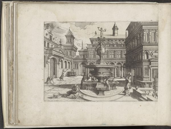 This drawing of a Fountain with a Statue of Moses was made by Joannes van (I) Doetechum in the late 16th century. Immediately noticeable is the linear precision used to render this elaborate architectural scene. The crisp lines and their calculated arrangement create a measured depth, pulling us into a Renaissance space defined by balance and proportion. Doetechum’s work uses the language of architectural rendering to explore themes of order and humanism. The fountain, adorned with figures and set within a structured courtyard, embodies the Renaissance ideals of merging classical form with humanist values. Notice how the orthogonal lines converge to create an illusion, drawing the eye towards a distant vanishing point. This technique, crucial to Renaissance art, uses mathematical perspective not only to represent reality but to create a sense of rational harmony. The detailed rendering and the emphasis on spatial relationships, function not just as descriptive elements but as philosophical statements about humanity's ability to understand and control its environment.