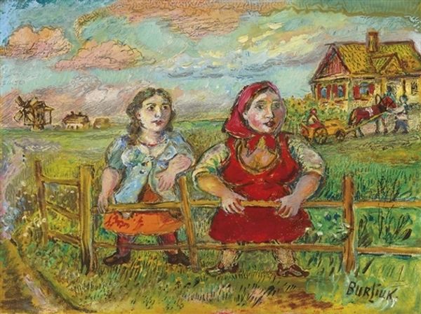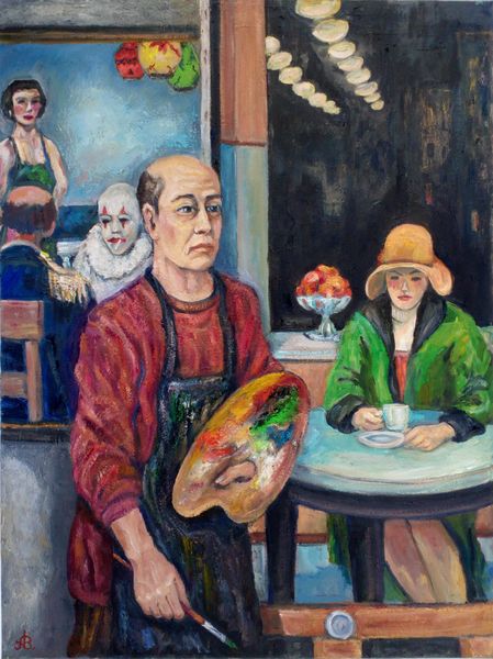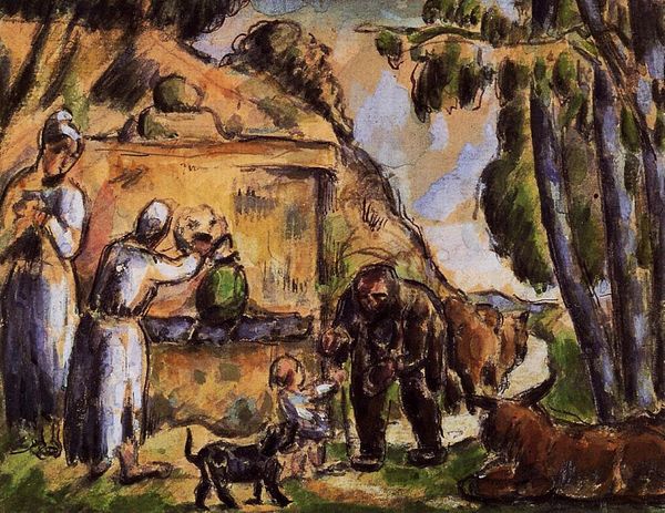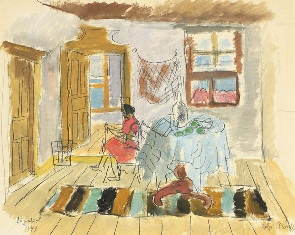 Curator: Here we have David Burliuk’s “Tea Time,” a delightful mixed-media painting that offers a snapshot of a cozy gathering. Editor: It makes me think of lazy summer afternoons. There’s something so charmingly imperfect about it – almost childlike in its simplicity, like a memory painted onto the canvas. Curator: Burliuk had a distinctive way of capturing scenes; he merges the use of oil paint with watercolor to describe what looks like a familial tea party. Look closely at the composition. How does it strike you? Editor: The colors are striking but, raw. There’s this fascinating push and pull between the figures clustered around the table, all very human-like, and the flattened perspective, as if they were sitting around a miniature toy house. The color, however, pulls the whole composition together by establishing a feeling of earthiness, comfort. Curator: It’s the synthesis of seemingly unrelated styles—landscape with group portraiture—that grants this piece its character, don't you think? The naive rendering certainly softens the whole view. What are some other features of this landscape that you like? Editor: I love the little, almost abstract figures dotting the landscape, the fowl creatures down front, but most intriguing of all might be that green horse, so still by the window, gazing at all of them enjoying teatime. What a quirky, enigmatic detail, adding a touch of folk tale and dream! Curator: Burliuk indeed wasn’t afraid of incorporating elements from folklore or his own imagination into his landscapes and portraiture. "Tea Time," in this way, reflects Burliuk’s desire to celebrate simplicity, inviting viewers to participate in the most banal, domestic tableaus of daily living. It seems almost utopian in its design, doesn't it? Editor: Absolutely. It's that directness that gives it such a poignant feel. It feels vulnerable, personal, like the scene's inviting you to take a seat to sip tea and stay a while, even with the imperfect surroundings.