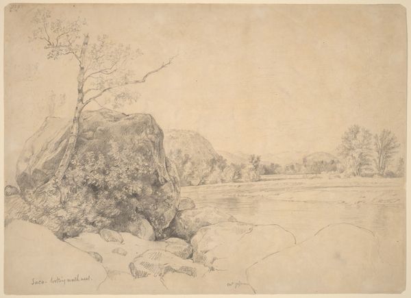 John William Casilear made "Rocks Along a Lakeshore" with graphite on paper. Casilear was part of the Hudson River School, a mid-19th century American art movement that romanticized the American landscape, often reflecting a sense of national identity and expansionist ideology, a concept known as Manifest Destiny. Here, Casilear’s focus on rendering the natural world takes on an ideological dimension. During this period, there was growing concern regarding the impact of industrialization and urbanization. In response, the Hudson River School offered an idealized view of nature as a source of spiritual renewal, framing it as distinctly American. His choice to depict scenes devoid of human presence may be seen as a way to emphasize the untouched wilderness, a narrative of purity that often overlooked the displacement and marginalization of indigenous populations. Casilear’s detailed sketches serve not only as studies of form and light but also as cultural artifacts, reflecting the complex relationship between art, identity, and historical context.
