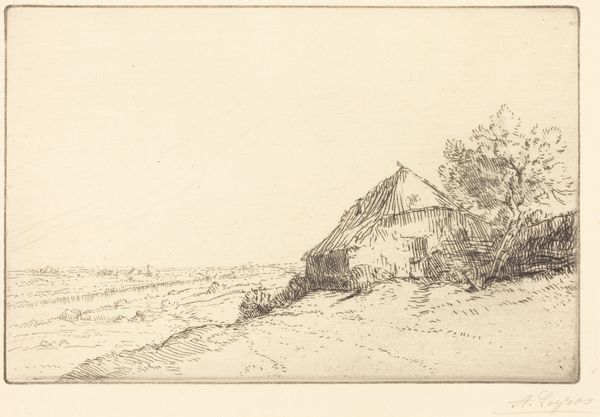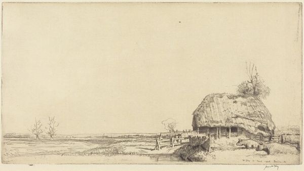 Curator: Here we have a pencil drawing titled "Boerderij met put," or "Farmhouse with Well," attributed to Georges Michel, likely created sometime between 1773 and 1843. Editor: My first impression is of stillness and solitude. It's rendered so delicately, almost ephemeral. The landscape feels hushed. Curator: Michel was deeply affected by the dramatic social shifts happening around him – the upheavals of the French Revolution, the rise of industrialization – all things that transformed the rural landscape he depicts here. He saw in these rustic scenes a kind of authenticity that was rapidly disappearing. Editor: The farmhouse becomes a symbol, then. A place of rootedness, a bulwark against the sweeping changes you mention. The well especially is an age-old symbol; a source, a primal link to sustenance. Curator: Absolutely. His technique is important too. Look at the subtle use of shading to create depth, even though it’s predominantly lines. He creates a sense of groundedness for a building about to vanish, as it is subtly but definitively fading from view, due to historical pressures and the erasure of agricultural land. Editor: You can really sense the precarity of it all. It’s faint but distinct. The overall image feels less like an objective portrayal of a farmhouse and more like an elegy. He draws the farmhouse delicately, creating a very specific atmospheric emotion in spite of, or perhaps because of, how minimal the work is. Curator: I agree. His work, including this particular rendering of an isolated farm, should also make us think about labor, and who historically occupies such a space. This farm has people dependent on it and it represents their work. It invites contemporary intersectional investigation of the historical forces which might put farmers in a specific region in vulnerable or compromised circumstances, perhaps for reasons related to their economic class or racialized status. Editor: Ultimately, this piece makes you think about how everyday life connects to our past through familiar symbolic markers. Curator: Yes, how spaces we may casually view have hidden meaning with great relevance for discussions about labor and class in our current socio-political climate.