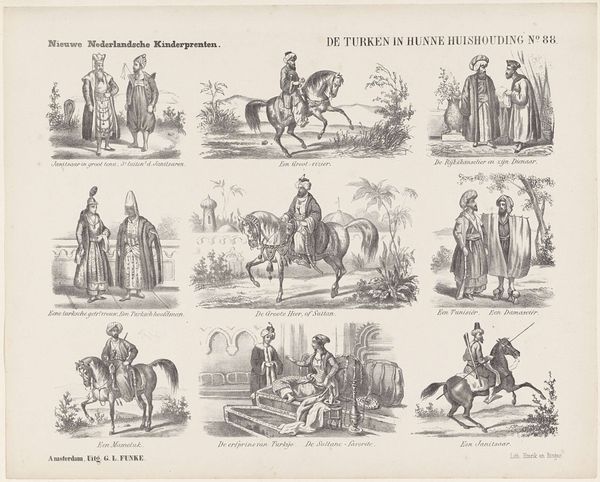 Curator: Here we have Jan de Haan’s "Voor het plakboek / (10)", dating from between 1875 and 1903, presented as a print. It looks like something pulled straight from a children’s book of the period. What strikes you immediately? Editor: Whimsy! A whole array of rustic scenes: animals, figures interacting in rural landscapes. It reminds me of a sampler, where you practice a bit of everything. There's a kind of unpretentious charm in its simplicity. Curator: Precisely. Consider the context: a "plakboek" translates to scrapbook. This wasn't meant as high art, but as material for personal collection, assembly, and use, a direct challenge to traditional art hierarchies by emphasizing everyday experience. Think of the families engaging with this image; cutting, pasting, rearranging. It shifts the point of art away from the art object to the process of making. Editor: I like that. It reframes our understanding, doesn’t it? Not just about consumption, but active participation. Looking closer, one cannot help but notice a distinct socio-economic reality portrayed, right? Rural labor, traditional gender roles - the woman struggles with the pig while the man is presented actively "working". This seemingly innocent picture book page then provides insights into a past culture’s modes of working. Curator: Absolutely, by investigating how the illustrations are produced, sold, and used, we start to recognize that even such apparently simple prints reveal underlying conditions related to labour, gender roles, class relations and economics of Dutch society. Editor: It highlights the social dynamics present, making it a lens through which we can understand more than the imagery. Curator: It underscores the idea that art doesn't exist in a vacuum; its creation, consumption, and meaning are always deeply enmeshed within specific material and social contexts. I appreciate de Haan’s embrace of accessibility within the art world and the challenge this piece places on hierarchies of culture production. Editor: Well said! Now, looking at it, I can see even more dimensions I hadn’t previously. It shows the capacity of a "scrapbook" element to reveal narratives related to the social structure and values present at the moment of production, which makes one consider not only the picture’s message but who and what it served to empower and disempower.