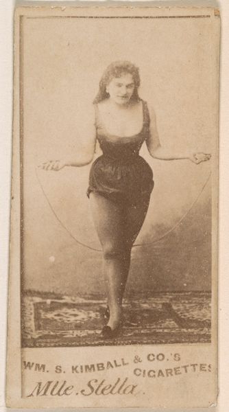 Curator: Oh, my! She looks as if she's about to leap right off the card and into the ocean. Editor: Indeed! This is "Card Number 79, Guillos," from the Actors and Actresses series produced by Duke Sons & Co. in the 1880s as an advertisement for Duke Cigarettes. What strikes me most is its function as a very public piece of ephemera. Curator: Ephemera, right, but it also feels incredibly… private. It’s a woman, posed, ready to dive, with such resolve. And, “Duke Cigarettes Are the Best.” Is that confidence or an odd juxtaposition? Editor: Well, these cards were essentially miniature portraits, intended to be collected and traded. Circulating these images normalized them, making celebrity and leisure—even diving, a then-modern activity—familiar parts of everyday culture. Smoking itself was on the rise and the modern "Duke" label assured consumers they were with the times. Curator: Right, she’s diving into the current culture, the swell of popularity for, er, everything. The monochromatic, sepia tones really play to that nostalgia. And her face, determined but calm... I wonder who she was outside this cigarette-sponsored snapshot. Editor: That’s the mystery these images present. Was "Guillos" a stage name? Was she actually an actress or simply a model hired for this purpose? We see so many examples from the period but know so little about them. The lack of sharp definition softens her stance, so it's about to happen... Curator: Exactly. The blurring kind of liberates her— makes it more like feeling than fact. You know, even today, seeing this little picture brings me a flutter. An odd longing. It whispers about aspiration, even as it shouts about cigarettes. Editor: Well put! It certainly makes me consider how advertising doesn't simply sell products. These images reveal anxieties and aspiration and shape a whole new set of popular cultural behaviors. Even down to its small size, there's an interesting democratic ambition—a portable work for anyone's pocket. Curator: A little dive into an endless sea… and all for a smoke. Fascinating.