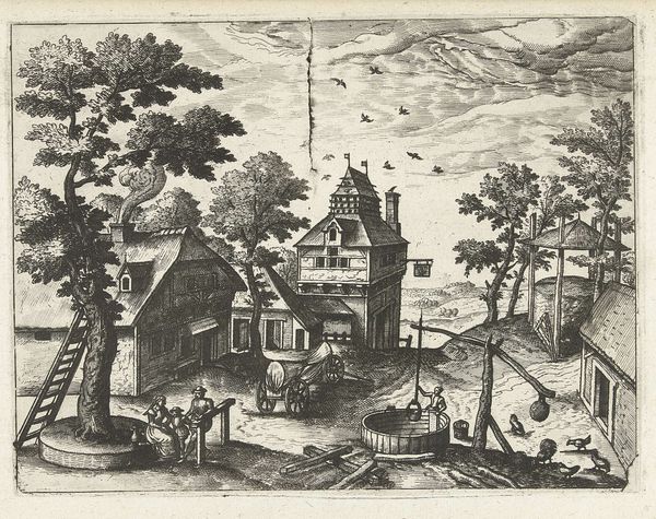 Curator: Welcome. Before us is “Oktober,” a print made by Julius Goltzius sometime between 1560 and 1595. It currently resides in the Rijksmuseum. Editor: My first impression is how serene the scene is, even though it's brimming with activity. The artist manages to create such a peaceful, rustic atmosphere, even in monochrome. Curator: Indeed. Goltzius expertly uses line to define form and texture. Notice how varied the hatching and cross-hatching is; this creates depth and a subtle tonal range despite the work's limited palette. This piece also reveals his ability to organize and formalize everyday settings. The composition, almost rigidly structured, is balanced to achieve symmetry, yet the depiction of reality provides a captivating narrative. Editor: I find this narrative particularly interesting when viewed through a class lens. There's labor here, quite obviously, but it's presented without critique or commentary. The wine-making seems idyllic, which of course obscures the backbreaking nature of the work for many people. Are we romanticizing exploitation through this depiction? I find this ambiguity rather complicated, the figures blend into their surroundings creating a collective almost dreamlike feel to labor. Curator: Your reading certainly complicates a straightforward interpretation, but the linear precision lends the artwork a heightened sense of clarity and order, reflecting the Renaissance humanist pursuit of understanding and codifying the world. The engraving displays remarkable detail in the costumes, the architecture, and even the flight of birds in the sky. Editor: Precisely, but consider who this clarity serves. The art becomes a tool for control, setting an artificial boundary of normalcy, creating division and bias that continues even to today. While you look closely to the engraving technical ingenuity, the class consciousness within asks hard and perhaps inconvenient questions. The engraving presents an interpretation for labor—the beauty or ugliness and its perception of labor and place. Curator: A potent observation! On its own, “Oktober” presents viewers with an example of line art as technical mastery and artistic order. Editor: But considered within its context, it encourages crucial dialogues about power, representation, and the persistent relevance of visual rhetoric in shaping social consciousness. It seems rather appropriate this hangs at the Rijksmuseum given its legacy, though many forget art does not offer neutrality.