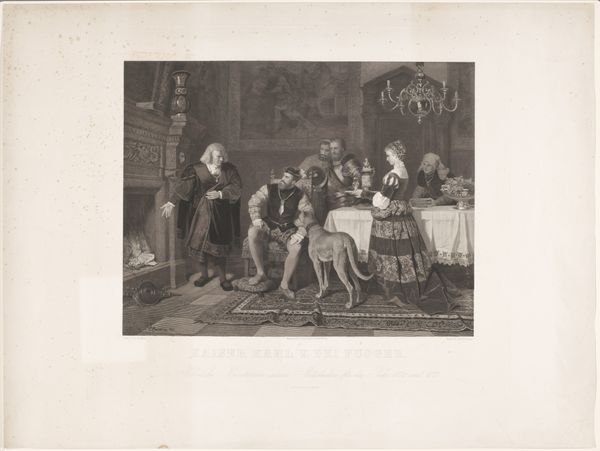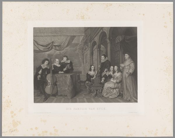 Editor: This is "Interior with a Group of People Making a Portrait of a Man," a print made by Jean-Baptiste Madou sometime between 1806 and 1877. It strikes me as a staged scene; everyone seems quite stiff. What's your read on it? Curator: It’s fascinating how Madou captures the burgeoning bourgeois obsession with portraiture. Think about it – previously, having your portrait made was exclusively for the aristocracy. This engraving reflects a societal shift where the middle class aspired to, and could afford, this type of representation. Editor: So, the print is documenting, and perhaps democratizing, access to portraiture? Curator: Precisely. And consider the setting; the comfortable domestic interior signifies stability and social standing, things that the rising middle class would find valuable to portray. Look at the details - the fashionable clothes, the carefully arranged furniture, and the sheer number of people involved in the portrait-making process. Editor: Right, there are a lot of people there! Are they all directly involved in making the portrait? Curator: Possibly not all involved, but their presence suggests a performance of social status, where being seen and admired was as important as the artwork itself. The ‘realism’ of the scene also aligns with the public’s desire for accurate and relatable portrayals of everyday life. Is it a document of history or more of a theater piece? Editor: So, in a way, this image isn't just about art, but also about the changing social landscape? Curator: Exactly. It’s a visual record of a culture in transition, where art became intertwined with identity and social mobility. Editor: That really puts it into a different perspective for me. Thanks for the insights! Curator: My pleasure! It's these dialogues that allow us to really interrogate what is being visually represented.