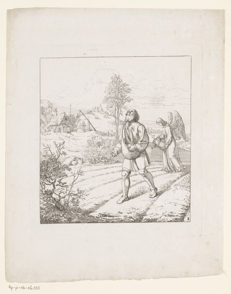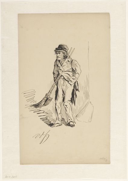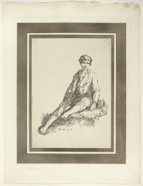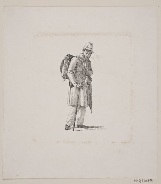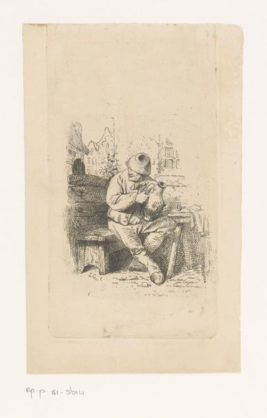 Editor: Here we have Johann Georg Wille’s "Soldaat gezeten op rotsblok met schild en lans," made in 1753. It's an engraving printed on paper, and depicts a seated soldier with a spear. He seems weighed down by something, a melancholic figure. What stands out to you about this piece? Curator: The material reality of this engraving speaks volumes. Consider the labour involved in creating those precise lines. Each mark is a deliberate act of production, transforming a blank copper plate into an image intended for mass consumption. We must consider who was buying these prints, and what role they played in 18th-century society. Editor: So you see it as a commodity, not just a piece of art? Curator: Absolutely. And it bridges high art and craft. Engraving was both a reproductive method, disseminating paintings to a wider audience, and an artistic skill. The image shows a soldier, yes, but it is also about how images of soldiers were circulated, consumed, and understood. Where were these prints displayed? How were they viewed? How does the reality of making the print change our perception of it? Editor: That's interesting. I hadn't thought about it in terms of production. I was caught up in the figure’s possible emotions. Curator: The material is inseparable from the meaning. The lines, the paper, the ink, the production – they tell a different kind of story, one of labour, distribution, and societal values. Editor: I see what you mean. I’ll definitely pay more attention to how art is made from now on! Thanks! Curator: A closer inspection of materiality offers so much insight. I hope this changed your perspective about similar pieces going forward.