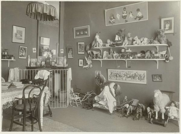Henry Pauw van Wieldrecht made this photograph of a room in a country house, sometime before 1912. It's a packed interior, a real cabinet of curiosities, captured in shades of gray. What strikes me is the texture - not just of the objects, but of the photograph itself. You can almost feel the grain of the paper, the way the light catches on its surface. It’s a tactile experience, even though it's a visual one. Look at the way the light falls across the deer heads mounted on the wall, or the spines of the books crammed onto the shelves. Each object seems to have its own story to tell, a little echo of lives lived and memories made. It reminds me of the way Gerhard Richter uses photography as a starting point for his paintings, blurring the lines between representation and abstraction. Both artists seem interested in how we perceive reality through a lens, whether it's photographic or painterly. It's like they're saying, "Here's a picture, but what does it really mean to see?"