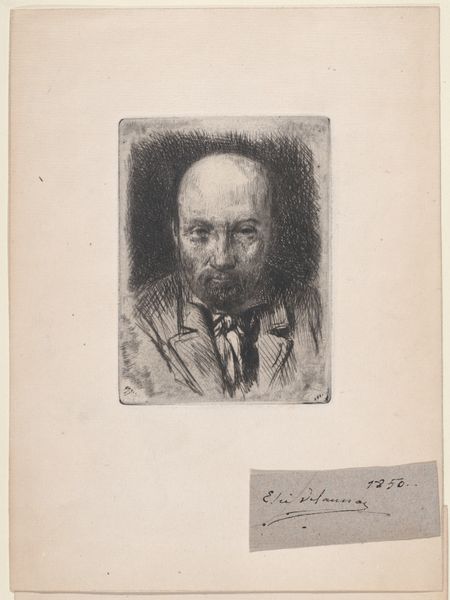 Curator: Here we have Max Liebermann's "Self-portrait," currently residing in the Harvard Art Museums. Editor: He looks like he's about to give me some very serious, possibly unwelcome, advice. Very intense. Curator: Liebermann was a leading figure in German Impressionism, and this etching showcases his skill with line and shadow. It’s interesting to consider his place in art history given the later condemnation of his work by the Nazis. Editor: There's such confidence in those lines, even the quick, almost scribbled ones. It’s like he knew exactly what he wanted to convey. Curator: Self-portraits can be powerful statements of identity, especially when created during times of political and social upheaval, don't you think? Editor: Absolutely. It’s his gaze, so direct. What does it mean to meet your own eyes in this way, and then put that out into the world? Curator: Precisely. The act of self-representation becomes a powerful form of agency. A fascinating work, indeed. Editor: Gives me chills.