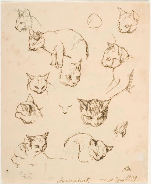Editor: We're looking at "Het leven en bedrijf der katten," or "The life and business of cats," a print and watercolor piece, likely from between 1843 and 1920, by Hermann van der Moolen. It's essentially a page filled with vignettes of cats in various activities. I find it quite charming. What strikes you most about this collection of feline snapshots? Curator: It's a fascinating piece because it encapsulates how the 19th century increasingly viewed animals – not just as utilitarian creatures but as subjects worthy of observation and, dare I say, anthropomorphism. Genre painting, depicting everyday life, became incredibly popular, and here we see it applied to the domestic sphere of cats. The scenes feel very staged and moralistic, though. Does that resonate with you? Editor: I see that! It’s like little morality plays acted out by cats. Like the cat perched precariously on the vase, or the cat cornering a mouse. Are these scenes designed to reflect certain human behaviors, through cats? Curator: Precisely. Think of the burgeoning middle class, the rise of pet ownership, and the sentimentalization of domesticity. This print catered to that market, subtly reinforcing societal norms. Cats, already associated with independence and mystery, now also become symbols of family life and perhaps even gentle satire. Consider the ways in which social satire has been applied to animal protagonists in other artworks through history. What visual cues do you notice that support this interpretation? Editor: The detail! Look at how the artist meticulously renders the cats' fur and their expressions, making them relatable, even comical. It speaks to a public who had the time and interest to appreciate such detail. It’s interesting to consider the print as a commodity, too – a reflection of social trends in its time. Curator: Absolutely. And that detail made it easier for the viewers of the time to recognize in these animals those behaviours and types that amused and comforted them in the increasingly impersonal urban spaces. Editor: That definitely broadens my understanding of the work beyond just cute cats. I now appreciate how it reflects broader societal values and the cultural context of its time. Thanks!