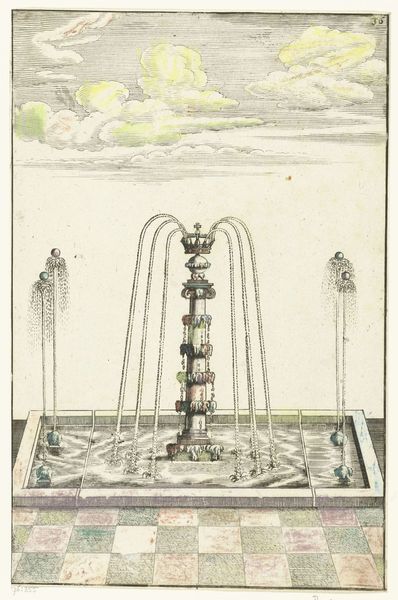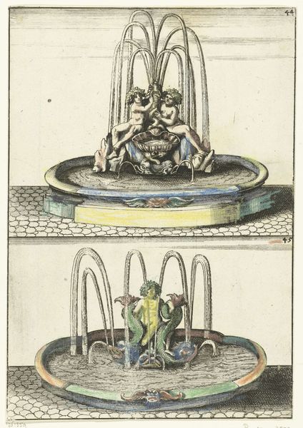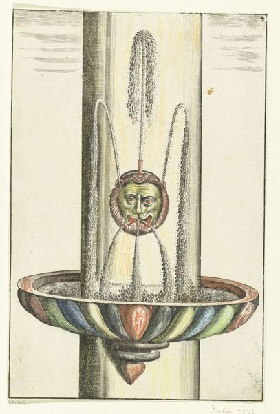Editor: Here we have "Round basin with putto," a 1664 print and drawing of ink, watercolor, and engraving by an anonymous artist. There’s something melancholy about this lone figure standing in the cascading water. How do you interpret this work? Curator: This image strikes me as deeply symbolic, and potentially as an explicit attempt to evoke discussion around social standing and hierarchies of the era. Notice how the putto is centered and elevated. Does it suggest ideas of power, innocence, or perhaps vulnerability within societal structures? Editor: I hadn’t considered vulnerability. Is the fountain structure itself significant? Curator: Absolutely. Consider fountains in the Baroque period. They were grand displays of wealth and power. However, they were also spaces of social interaction, sometimes inaccessible to certain groups of people. How might that tension play into our understanding of the putto’s isolated placement within the fountain? Is this child an icon, or is it isolated? Editor: So, the artist might be making a statement about who benefits from luxury and who is excluded? Curator: Precisely. And, considering the historical context, think about the child as representative of, or contrasted against, different experiences across the range of social classes at the time. What do the work’s components evoke when considering the complex issues of the era, like unequal social access? Editor: That reframes the entire work. I initially saw it as just decorative, but now it seems much more critical. Curator: Exactly! Baroque art is far from just decoration. It is ripe for interrogating questions of identity, privilege, and social commentary that continue to be relevant. Editor: Thank you. This piece offers more than I originally realized.