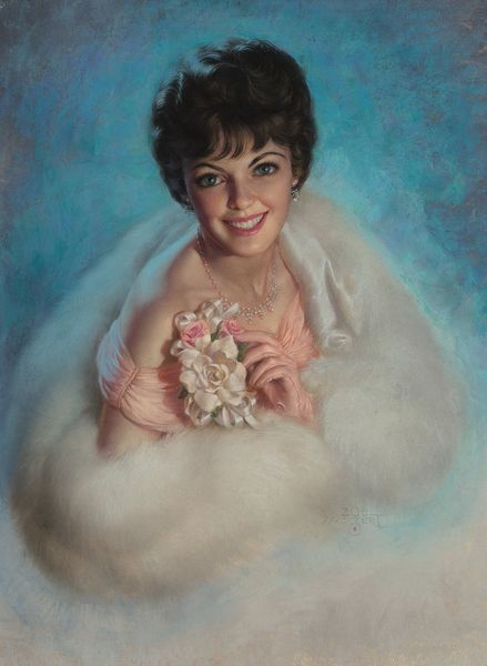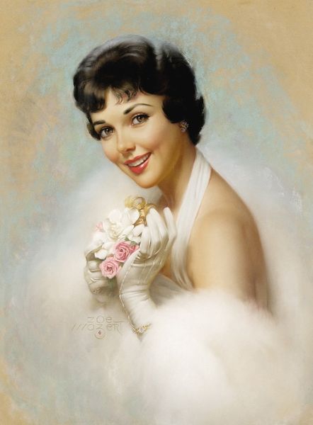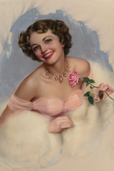 "Beauty in Magenta" was made by Zoe Mozert, a commercial artist who began her career in the 1920s. Mozert’s work reflects the evolving representations of women during this transformative era, a time when women were pushing boundaries and challenging traditional roles. In this artwork, the woman's gaze meets ours directly, asserting her presence and confidence. She's adorned in a magenta dress and jewelry, surrounded by a soft white fur, embodying elegance and allure. Mozert’s pin-up art often depicted women as both glamorous and self-assured, reflecting the changing ideals of femininity. Her art provided a space where women could be seen as multifaceted individuals, embracing their sexuality while maintaining agency. While she worked within the male-dominated field of commercial art, Mozert’s unique perspective allowed for more nuanced and empowered portrayals of women. Her work evokes a sense of aspiration, reflecting a desire for a more equitable and expressive society.