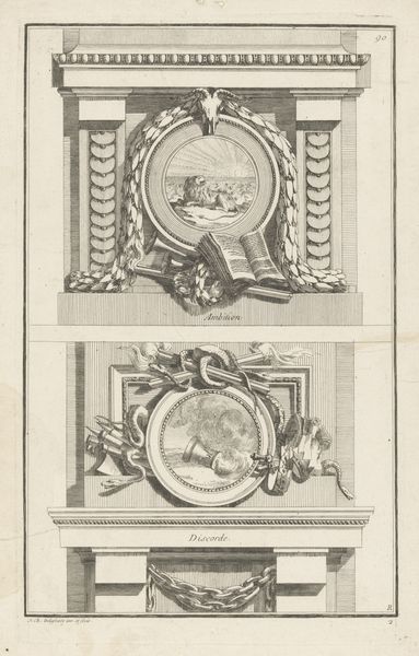 Curator: Well, here's something fascinating. What are your immediate impressions of this print titled "Thracie"? Jean-Charles Delafosse produced this engraving somewhere between 1768 and 1771. Editor: It's like a fever dream from a historical museum gift shop. Ornate, a bit excessive, and yet, weirdly… flat? The level of detail feels at odds with the simplicity of the composition. Is that deliberate, I wonder? Curator: I think you've hit upon a key element. Delafosse, a figure steeped in the aesthetics of the Baroque era, clearly sought to cram a lot of information into this one sheet. It almost reads like an emblem book. He was cataloguing a lot of images and ideas from the antique past. Editor: An emblem book for interior decorators of the 18th century! Those winged figures sprouting from the vase handles give me an eerie mermaid-gone-angel vibe. And below, this swirling chaos in that circular medallion is like the inside of an idea churning. What does it mean to see artifacts as abstract thought? Curator: Consider that classical motifs—vases, medallions, laurel wreaths—weren't just decorative. They symbolized specific virtues, empires, histories. The medley of objects—busts, writing tablets—within the medallion seems intent on evoking the cultural potency of Thrace itself, but in a totally abstracted symbolic language. Editor: A language we’ve mostly lost, I suspect. Looking at it now, there’s something mournful here, as if those symbols, ripped from their original context, are silently pleading for understanding from viewers removed from them in time. Or is it just me projecting? Curator: Not at all. Memory operates this way: fragments pieced together to reconstruct an ideal whole that may or may not accurately reflect what came before. Delafosse's Thracie presents not so much Thrace itself but an evocation of its memory, filtered through 18th-century eyes. It's almost like proto-nostalgia. Editor: So it's both a document and a yearning. Looking at all the little flourishes of a civilization, not an argument. I appreciate the layers of this, thank you! Curator: Yes! The work invites us to appreciate and interrogate the complicated dance between cultural legacy and personal imagination, a reminder that all representations are but a fleeting capture of ever-evolving concepts.