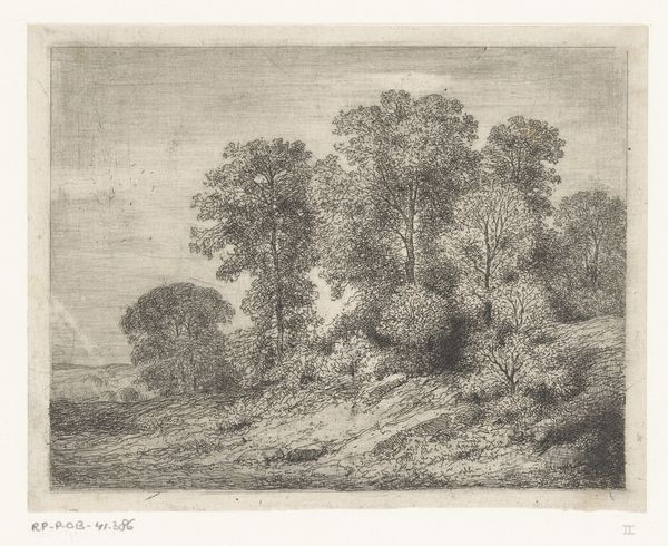 Editor: This is “Groep bomen in een heuvelachtig landschap,” or “Group of Trees in a Hilly Landscape,” a pencil drawing by Maurits van den Kerkhoff, from 1852. I'm struck by how detailed it is, especially given it’s just pencil. It's almost photographic in its realism, yet still feels… dreamy. What do you see in it? Curator: Initially, I see a masterclass in tonal range, skillfully executed in pencil. Notice how van den Kerkhoff modulates the grey scale to create depth and texture. The contrast between the dark, earthy foreground and the ethereal background produces a palpable sense of space, and light. How does the composition lead your eye through the artwork? Editor: Well, my eye definitely goes to the biggest tree first, almost in the center. And then kind of follows the slope of the hill down and to the right. It's a very gentle, curving path. Curator: Precisely. And consider the role of line in defining form. Observe the meticulous hatching and cross-hatching employed to render the volume and surface quality of the trees and the landscape. The artist uses a sophisticated language of marks to build form and simulate texture, doesn't he? Editor: Definitely. The tree bark looks so real, you could almost reach out and touch it! I hadn’t really thought about how much information you could convey with just pencil strokes. Curator: The intrinsic quality of mark-making, isn’t it fascinating? Consider, for instance, how van den Kerkhoff has captured the essence of nature using the most fundamental of artistic means. It really speaks to the timeless power of formal elements. What do you make of this insight? Editor: I see your point. It makes me appreciate the artist's technical skill even more, seeing how effectively he's used just pencil and paper to create something so immersive and beautiful. Thank you!