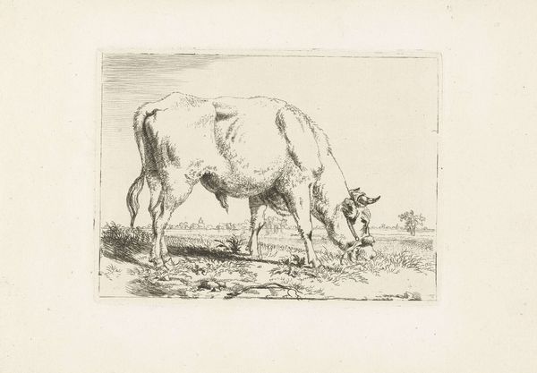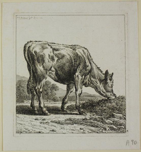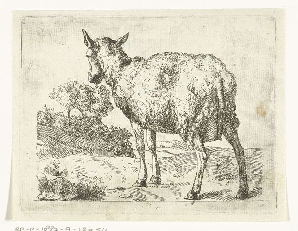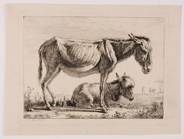 Editor: Here we have "Jenny with its Foal," a print by Jean-Jacques de Boissieu from 1797. It's a remarkably detailed drawing, and there's a melancholic mood in the quietness of the scene. How do you interpret the symbolism present? Curator: The figures of the jenny and foal, rendered with such care in this landscape, transcend mere animal portraiture. Donkeys, throughout history, have often carried the weight of labor, servitude, and even humility in symbolic terms. In agrarian societies, they represented steadfastness, and of course, maternal devotion. Considering the date, the image evokes the burdens of the era and the unyielding nature of those who carry them, don't you think? Editor: That’s a beautiful way to put it. The artist seems almost reverent, wouldn’t you say, in his depiction of such a humble animal? The subtle figures in the background also seem to emphasise Jenny’s presence. Curator: Indeed. The careful detailing—the texture of the jenny’s coat, the posture of the foal—elevates them. It speaks to a shift in perspective, valuing the often-overlooked aspects of life. Can you sense a certain romanticism emerging from the pastoral tradition? Editor: Absolutely, now that you mention it! It’s a reminder that symbols shift in meaning according to their context. I had initially interpreted it as an image of simple, rural life, but it seems there’s far more to it. Curator: Precisely. Consider also the enduring power of these archetypal images. They continue to resonate with audiences, reflecting our complex relationship with the natural world and our own burdens. Editor: I will certainly look at prints of animals with new eyes. Thanks! Curator: Likewise! I'm reminded of how enduring and multivalent symbols are in art and life.