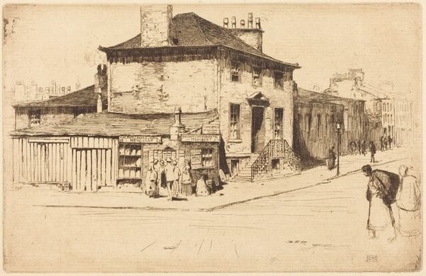Editor: This etching, *The Little Fish Shop, Chelsea Embankment*, by Theodore Roussel, from around 1888, presents a rather subdued street scene. There's a stillness to it, despite the figures present. What strikes you when you look at this piece? Curator: I notice how the fish shop isn’t just a building, it's a stage upon which social interactions unfold. Consider the lamppost: it’s almost totemic, dividing the public space from the more intimate setting of the shop’s doorway. Editor: Totemic in what sense? Curator: In that it's a constructed, ornamented symbol of society itself, a beacon representing order and perhaps even aspiration. And observe the window boxes above; bursting with life, contrasting the muted tones below. Are they symbols of domesticity attempting to soften the industrial world, or an artificial construction that doesn’t necessarily portray the conditions of reality for people? Editor: I never thought of window boxes as symbolic before. It makes me wonder if other seemingly minor details also carry similar weight. Curator: Absolutely. Roussel seems to invite us to interpret the psychological interplay between urban existence and human intimacy, reflected in the contrasting light and shadow. Does it feel voyeuristic to you at all? As if the image captures the quiet stories unfolding behind the shop’s facade? Editor: A little, actually! The dark interior does invite speculation. Thanks; I’ll definitely view cityscapes differently from now on! Curator: It’s about recognizing that every element contributes to the collective memory, offering insights into both the artist's and our own perceptions of the urban environment.