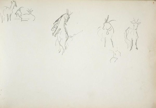 Editor: This is "Koeien," which translates to "Cows," a pen and ink drawing on paper by Carel Adolph Lion Cachet, from around 1930, currently residing in the Rijksmuseum. It seems like a collection of preliminary sketches, almost like a page torn straight out of the artist's sketchbook. What do you see in this piece? Curator: What strikes me is the artist's reduction of form. Observe how Cachet, through a delicate economy of line, manages to convey the essence of "cow." Note how the lines do not labour to create photorealistic details. Instead, the sketch emphasizes the fundamental structural qualities of the animal form – mass, weight, posture. It is a sophisticated engagement with the semiotics of animal representation. Do you see it as a completed work, or something else? Editor: I see it as a study. The lines are so fluid and unburdened. It doesn't feel like a finished statement, but more like an exploration, or as raw observations, captured quickly. The variations in perspective are interesting, too. Curator: Precisely! Consider also the white space – the negative space. It's not merely "background," but an active component in the composition. The cows emerge from the void, their existence defined by the interaction between the drawn lines and the untouched paper. The sketchbook format is also very revealing; the medium itself invites us to examine the artmaking process. This self-reflexivity, I think, is central to understanding the work. Editor: So, it is not about perfection or replicating a real-world cow, but understanding the rudimentary elements of form? I guess the point isn't just cows, but the way line and space coalesce to create them. It also offers insight into the artist's process. Thank you, I learned so much! Curator: Indeed. By stripping away the superfluous, Cachet forces us to confront the very nature of representation. A worthwhile endeavor.